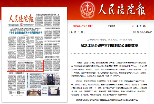 《人民法院报》头版报道:黑龙江健全破产审判机制促公正提效率