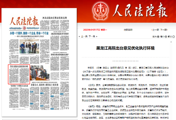 《人民法院报》头版报道:黑龙江高院出台意见优化执行环境