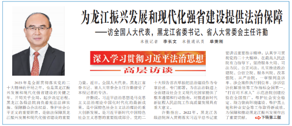 2023年是全面贯彻落实党的二十大精神的开局之年,也是黑龙江振兴发展和现代化强省建设的关键之年。开局关乎全局,起步决定后程。黑龙江各级法院肩负着宪法法律实施、保障群众合法权益、维护社会公平正义的重要职责,是依法保障黑龙江振兴发展和现代化强省建设的重要力量。近日,全国人大代表,黑龙江省委书记、省人大常委会主任许勤接受了本报记者的专访。许勤说,习近平法治思想是马克思主义法治理论中国化时代化的最新成果,是中国特色社会主义法治理论的重大创新发展,是习近平新时代中国特色社会主义思想的重要组成部分。党的二十大报告首次单独把法治建设作为专章论述、专门部署,为在法治轨道上全面建设社会主义现代化国家提供了根..