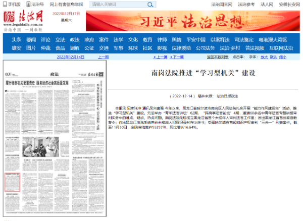 今年以来,黑龙江省哈尔滨市南岗区人民法院扎实开展“能力作风建设年”活动,推进“学习型机关”建设,先后举办“青年法官讲坛”62期,“民商事法官论坛”4期,邀请60余名中青年法官专题讲授审判实务中的难点、疑点、热点问题。南岗法院先后成立黑龙江省首个未成年人审判法官工作室;发出黑龙江省首份家庭教育令;作出黑龙江法院系统首份未成年人犯罪记录封存决定书;受理哈尔滨市首起知识产权审判“三合一”刑事案件。截至11月30日,全院审结案件55257件,同比增长16.64%。