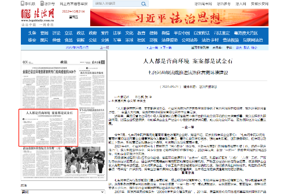 “人人都是营商环境,案案都是试金石,七台河法院为经济高质量发展提供了有力司法服务和保障,我为这里的法官点赞。” 全国人大代表、宝泰隆新材料股份有限公司董事长焦云说。近年来,黑龙江省七台河市中级人民法院认真贯彻落实党中央作出的优化营商环境的重大决策部署,充分发挥审判职能作用,加强企业权益保护,帮助解决企业生产经营中存在的涉法涉诉问题,助力优化营商环境,服务保障经济高质量发展。一企一策今年7月,七台河中院开展优化营商环境走访调研企业时,党组书记、院长刘伟告诉企业家们:“七台河中院以优化营商环境和促进民营企业健康发展作为重要政治责任,着力在更新思想理念、强化审判职能、创新服务举措、..