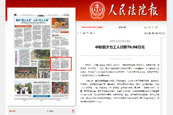 《人民法院报》报道集贤县法院:中秋前夕为工人讨薪70.58万元