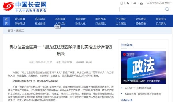中国长安网:得分位居全国第一!黑龙江法院四项举措扎实推进涉诉信访质效