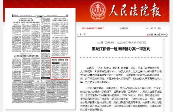 近日,黑龙江省伊春市中级人民法院对一起涉案金额特别巨大、被害人众多、黑龙江省打击整治养老诈骗专项行动重点挂牌督办案件进行一审宣判,以诈骗罪判处被告人郭某无期徒刑,剥夺政治权利终身,并处没收个人全部财产;判处被告人李某有期徒刑八年,并处罚金人民币10万元。法院经审理查明,2016年4月,被告人郭某以非法占有为目的,在没有能力为他人办理退休的情况下,虚构能办理“三无退休”,通过其直接下线温某、王某等骗取2256名被害人钱款共计3922.56万元。其间,郭某通过使用委托网络科技公司开发虚假“龙江省社保中心”“退休生存认证”网站、指使他人组织被害人进行虚假认证、制作虚假退休票据等手段,使被害人误认为退休手续正在..