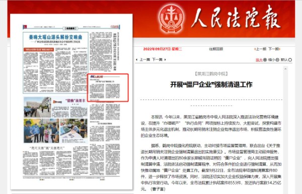 《人民法院报》报道:鹤岗中院开展“僵尸企业”强制清退工作