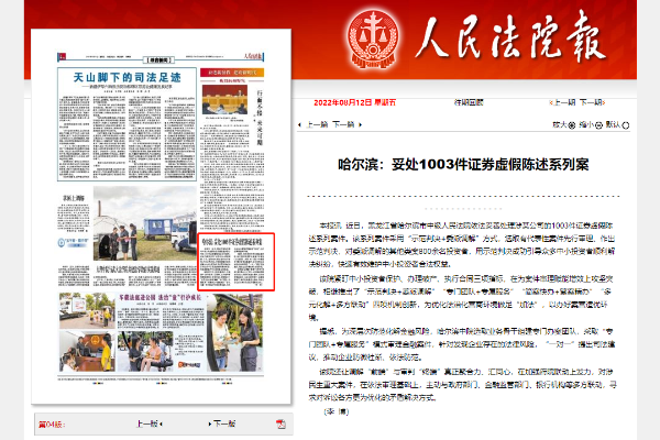 《人民法院报》:哈尔滨妥处1003件证券虚假陈述系列案