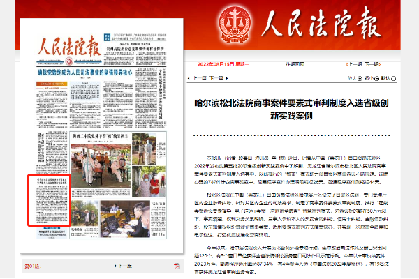《人民法院报》头版报道:哈尔滨松北法院商事案件要素式审判制度入选省级创新实践案例