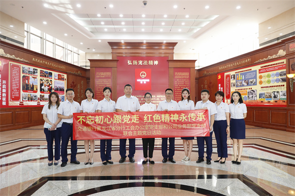 2022年8月2日,交通银行黑龙江省分行员工来到省法院参加“公众开放日”活动,感受法治文化,聆听法治声音,树立法治信仰。 参观党建大厅 李明瑶 摄 参观领袖故事长廊 李明瑶 摄 参观图书馆 李明瑶 摄 宪法墙矗立于党建大厅正中央,庄严肃穆,让每一名前来参观的人都印象深刻。一银行员工拿出手机将宪法墙的文字记录留存,时时学习,深藏于心。员工们还参观了党建大厅的其他展板、领袖故事长廊、图书馆、院史馆等场所。 参观宪法墙 李明瑶 摄 参观院史馆 李明瑶 摄 在宪法墙前合影留念 李明瑶 摄  ..
