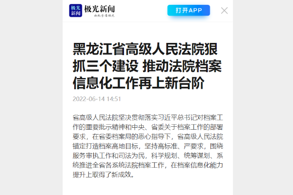 《极光新闻》:黑龙江省高级人民法院狠抓三个建设 推动法院档案信息化工作再上新台阶