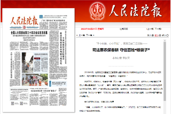 《人民法院报》头版:“手中有粮,心中不慌”,黑龙江建三江法院—— 司法惠农保春..
