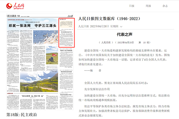 《人民日报》:全国人大代表、黑龙江省高级人民法院院长石时态——充分发挥好法治作用