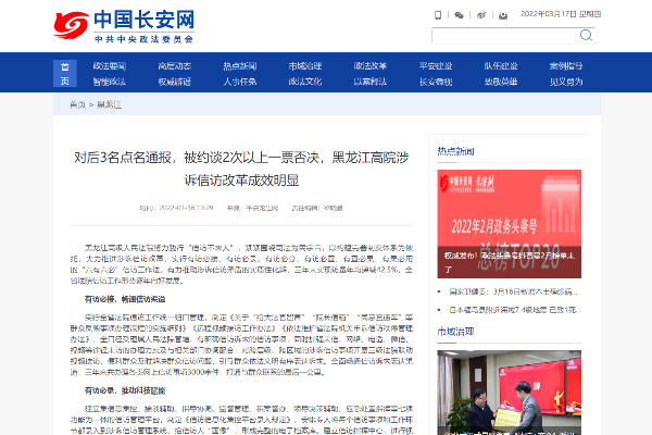 中国长安网:对后3名点名通报,被约谈2次以上一票否决,黑龙江高院涉诉信访改革成效..