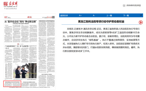 《法治日报》:勃利法院专项行动守护劳动者权益
