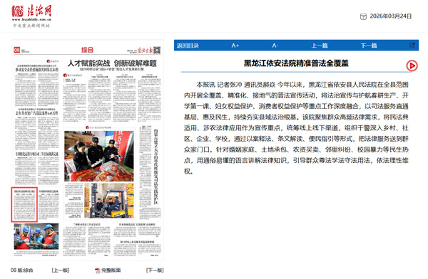 今年以来,黑龙江省依安县人民法院在全县范围内开展全覆盖、精准化、接地气的普法宣传活动,将法治宣传与护航春耕生产、开学第一课、妇女权益保护、消费者权益保护等重点工作深度融合,以司法服务直通基层、惠及民生,持续夯实县域法治根基。该院聚焦群众高频法律需求,将民法典适用、涉农法律应用作为宣传重点,统筹线上线下渠道,组织干警深入乡村、社区、企业、学校,通过以案释法、条文解读、便民指引等形式,把法律服务送到群众家门口。针对婚姻家庭、土地承包、农资买卖、邻里纠纷、校园暴力等民生热点,用通俗易懂的语言讲解法律知识,引导群众尊法学法守法用法,依法理性维权。