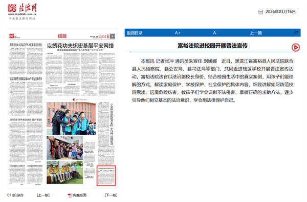 近日,黑龙江省富裕县人民法院联合县人民检察院、县公安局、县司法局等部门,共同走进辖区学校开展普法宣传活动。富裕法院法官以法治副校长身份,结合校园生活中的真实案例,用孩子们能理解的方式,解读家庭保护、学校保护、社会保护的具体内容,细致讲解如何防范校园欺凌、远离危险伤害,教孩子们学会识别不法侵害、掌握正确的求助方法,逐步引导他们树立基本的法治意识,学会用法律保护自己。