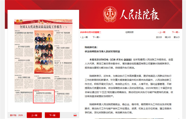 陆晓琳代表:依法保障胜诉当事人及时实现权益在听取最高人民法院工作报告后,全国人大代表、黑龙江省总商会副会长、博发康安控股集团有限公司董事长陆晓琳表示,报告指出要努力解决执行难,持续提升执行质效。陆晓琳表示,近年来,为推动执行工作高质量发展,更好地满足人民群众对执行工作的新期待和新要求,针对重大疑难复杂案件和长期未执结案件,人民法院创新工作方式,积极开展交叉执行,有效防止权力、关系、人情干扰,强化监督管理,不断提高执行质量和效率,依法保障胜诉当事人及时实现权益。2025年党的二十届四中全会审议通过的“十五五”规划建议明确指出,推动司法判决执行与破产制度有机衔接,依法有效盘活被查封..