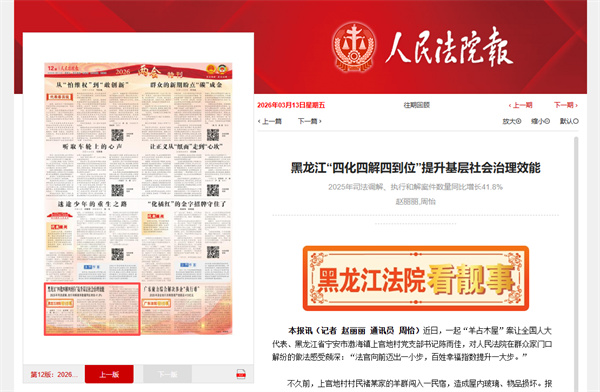 《人民法院报》:黑龙江“四化四解四到位”提升基层社会治理效能 2025年司法调解、..