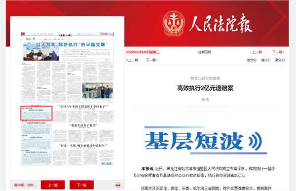 《人民法院报》:哈尔滨道里 高效执行2亿元退赔案