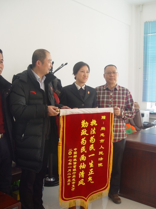 近日, 中国邮政储蓄银行尚志支行,为尚志法院送来了锦旗,感谢尚志法院2016年以来,在审理案件中公正高效的工作作风,为企业和优化法制发展环境提供了优质的司法保障。这面锦旗不仅是对尚志法院审判工作的认可,也是对尚志法院的激励。在2017年,尚志法院将继续坚持司法为民的宗旨,不断完善服务企业,积极促进辖..