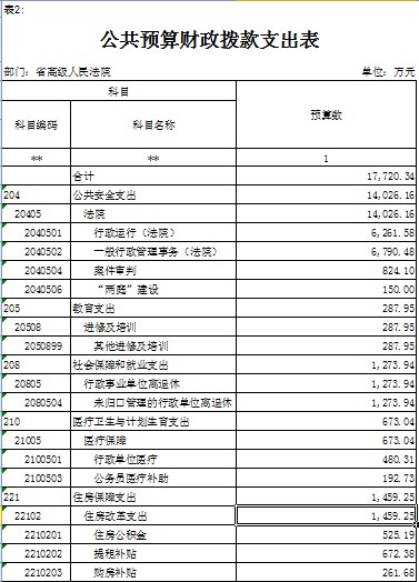 四、2014年公共预算财政拨款支出17720.34万元,其中:公共安全支出14026.16万元,增加4020.37万元,原因为2014年5个铁路法院经费纳入部门预算;教育支出287.95,增加15.5万元,原因为法官学院人员增加及工资调整; 行政事业单位离退休1273.94万元,增加318.73万元,原因为2014年5个铁路法院经费纳入部门预算及工资调整;医疗保障673.04万元,增加220.02万元,原因为2014年5个铁路法院经费纳入部门预算及工资调整;住房改革支出1459.25万元,增加375.64万元,原因为2014年5个铁路法院经费纳入部门预算。
