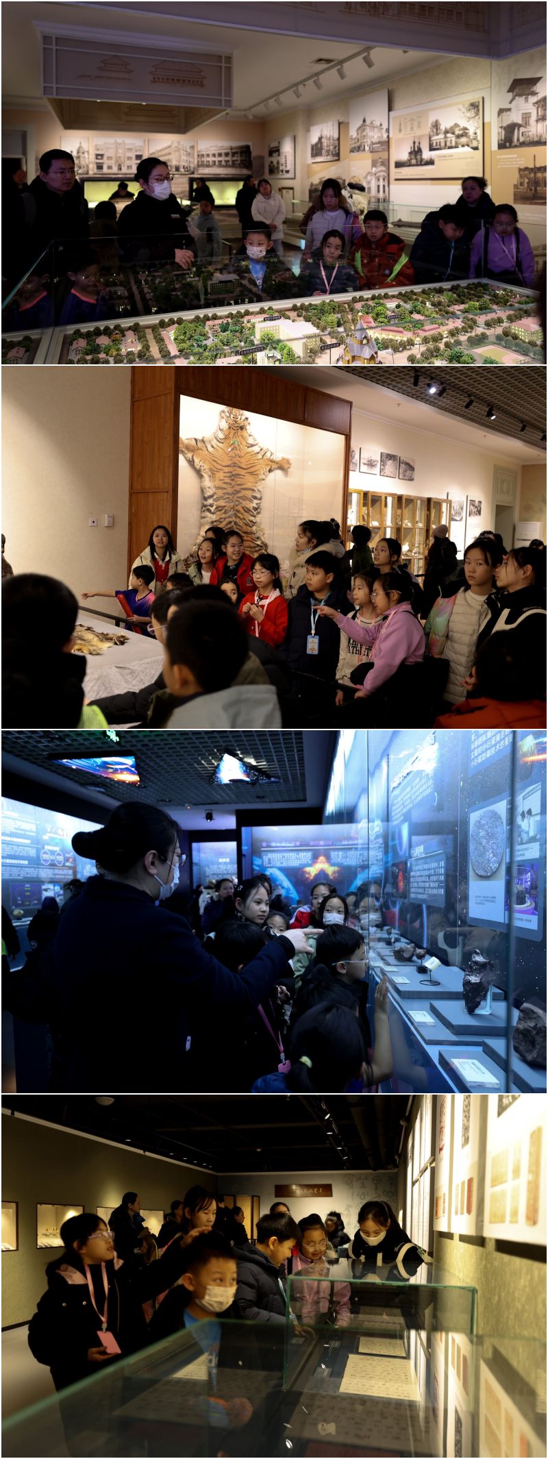 在博物馆专业讲解员的引导下,孩子们依次参观了多个特色展厅。再现早期俄侨生活场景的人物蜡像、黑熊、棕熊、东北虎等珍稀动物标本,以及精美瓷器与书画碑帖等丰富馆藏,生动勾勒出黑龙江深厚的历史文化底蕴与独特的自然风貌。其中,最引人注目的环节莫过于亲手触摸“天外来客”——世界铁陨石。这块珍贵的宇宙陨石让孩子们倍感新奇与兴奋,也在他们心中播下了探索自然科学、敬畏宇宙奥秘的种子。
