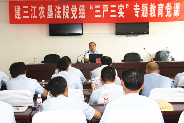 近日,建三江农垦法院党组书记、院长付文以讲党课的形式,生动形象的讲解“三严三实”专题教育精神,鼓励全院干警争做“让党放心、让人民满意、让法律增辉”的好法官。课上,付院长结合习近平总书记系列重要讲话精神、中央“三严三实”专题教育工作座谈会精神,联系法院工作实际,谈了自己对“三严三实”的认识和体..