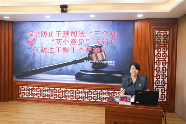 为严格落实防止干预司法“三个规定”的部署要求,扎实做好政策解读和填报工作,近日,佳木斯中院召开“法官讲堂”培训会,佳木斯中院督察室副主任任洪磊围绕“三个规定”记录报告平台填报工作作专题培训。 会上,任洪磊结合最高人民法院通报的典型案例对人民法..