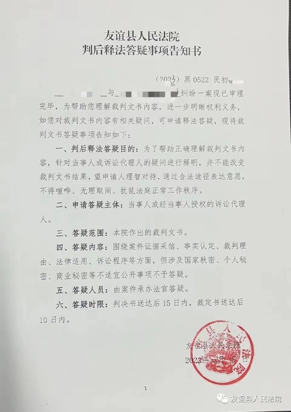友谊县法院:发出首份《判后释法答疑告知书》 让判决走进当事人的心里
