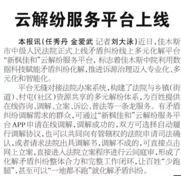 《黑龙江日报》报道:佳木斯中院“新枫佳和”云解纷服务平台上线