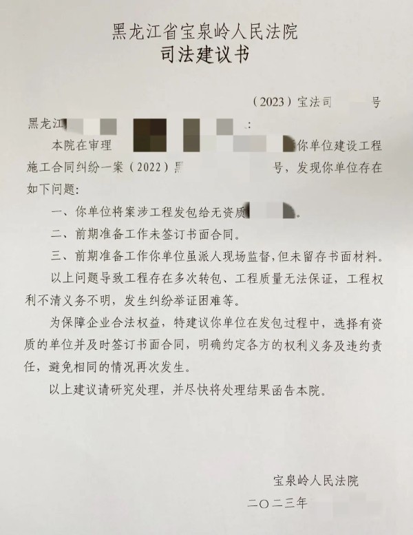 司法建议工作是人民法院坚持能动司法、延伸审判职能、提升社会综合治理能力的重要途径。宝泉岭人民法院积极在司法建议工作上寻求新突破,向辖区企业提出有针对性和可操作性的司法建议,推动营商环境治理多元化,切实打通优化营商环境“最后一公里”。案件详情近日,宝泉岭人民法院绥滨人民法庭在审理一起建设..