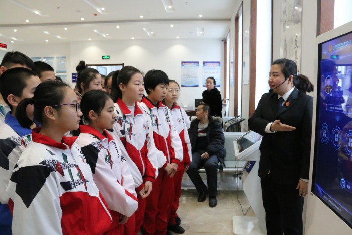 同学们安静有序地排队进入大厅,在讲解员的带领下,参观了诉讼服务中心、家事冷静室、少年法庭、羁押室、图书馆等场所。参观过程中,讲解员为学生们讲解了法的起源与发展、法徽的构成及意义、法院工作的流程,还让学生们亲身体验了法院智能化工作方式,帮助学生们树立法律意识,弘扬法治精神。