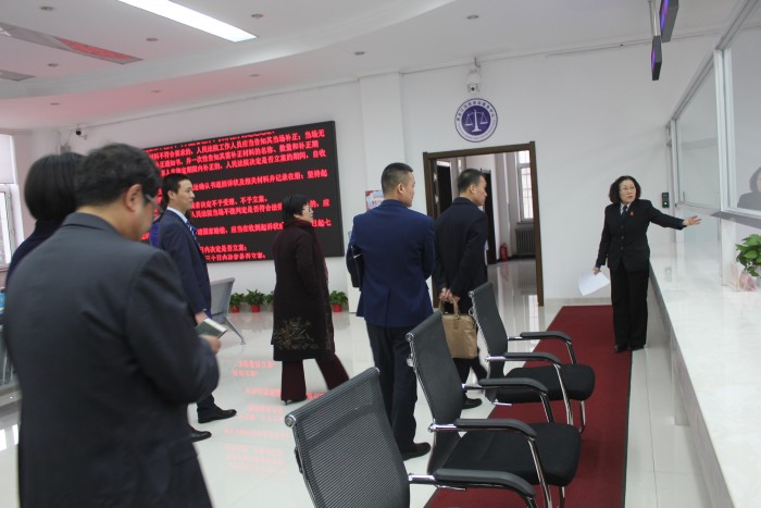 在宽敞明亮的诉讼服务大厅,立案一庭庭长苏娟向委员们详细介绍了立案制度和立案流程,从咨询指导、书写诉状、录入信息、现场划卡交纳诉讼费、更换票据、扫描形成电子卷宗、随机分案到审判庭,程序规范严谨、明晰完整。