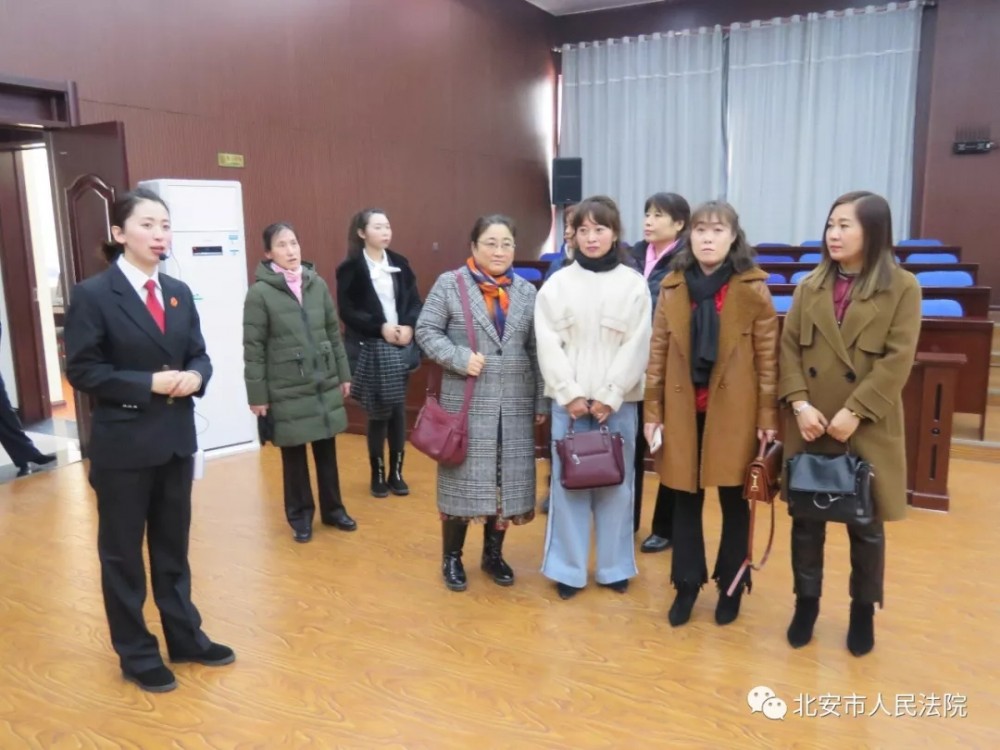妇女干部在法院讲解员带领下,先后参观“从延安到北安”红色文化长廊、诉讼服务中心、青少年法制教育基地、执行指挥中心、科技法庭、少年法庭、家事法庭等地。