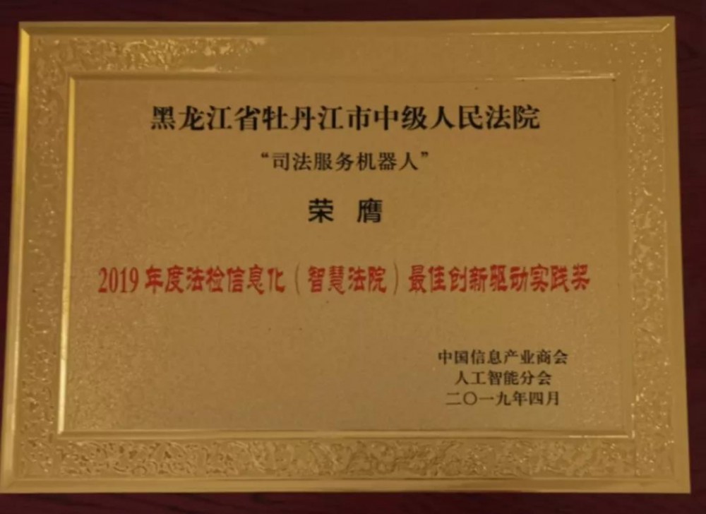 4月16日,由中国信息产业商会主办、中国信息产业商会人工智能分会承办的“2019第三届检法信息化融合发展创新大会”在天津市召开。会上,牡丹江中院“司法服务机器人”项目荣获2019年度法检信息化(智慧法院)最佳创新驱动实践奖。