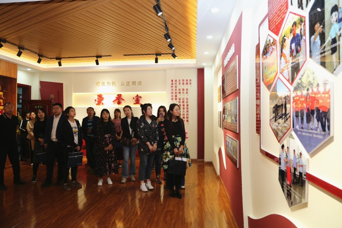 在主楼大厅参观了德柱、法柱、法眼观世界、中华人民共和国法官誓词和社会主义核心价值观浮雕展示。