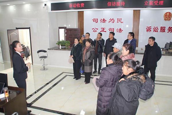 家属们依次参观了诉讼服务中心、调解室、审判庭、文化墙、图书室和荣誉室等场所。讲解员向家属们介绍了网上立案、跨域立案、多元解纷机制等“两个一站式”建设情况。诉讼服务中心设立的“打官司不求人指导卡”自取台、便民医药箱、可借用雨伞等便民设施也得到了家属们的认可。