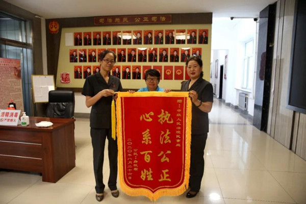 8月27日,一面鲜红的写有“执法公正 心系百姓”的锦旗交到了办案法官申丽英和迟丽杰的手中,年近七旬的老人,口中不停地说着自己心里的话:“我说给法官送点玉米、茄子这些家里的菜,你们也不要,我就想用锦旗表达我心中的感谢”!一番朴实的话语,道出了当事人的感激之意。