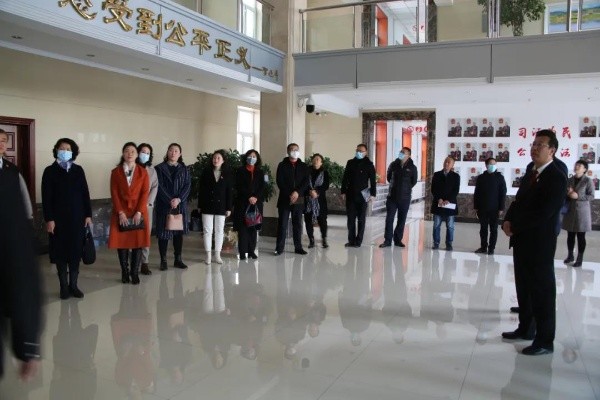 各位领导参观了中院执行指挥中心、诉讼服务中心、视频会议室、司法警察体能训练中心、审判法庭、文化长廊、荣誉室、图书馆等办公场所。活动中讲解员向各位领导介绍了两级法院干警文化作品入选“法徽闪耀”全省法院战疫诗文选和书画作品在省高院“庆祝建党99周年”书画摄影作品大赛获奖情况,参观领导高度评价中院的文化建设特色鲜明、形式新颖,文艺创作导向清晰、精品迭出,很有学习借鉴意义。