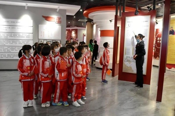 同学们在讲解员的引导下,有序排队进入法治教育基地、数字化审判法庭、图书馆等场所。