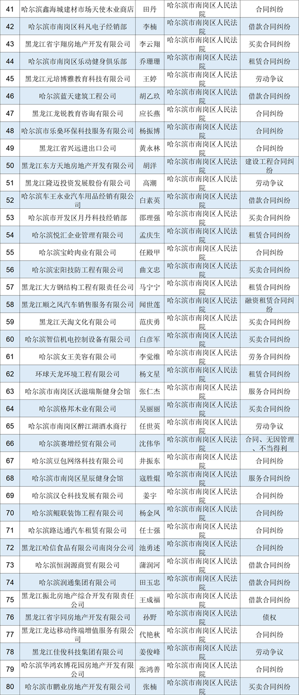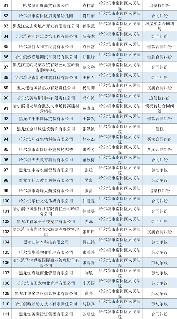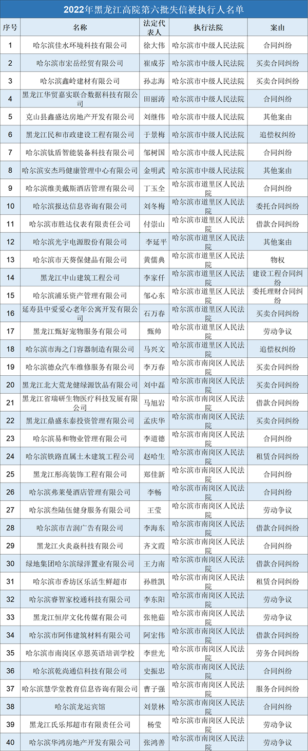 2022年黑龙江高院第六批失信被执行人名单