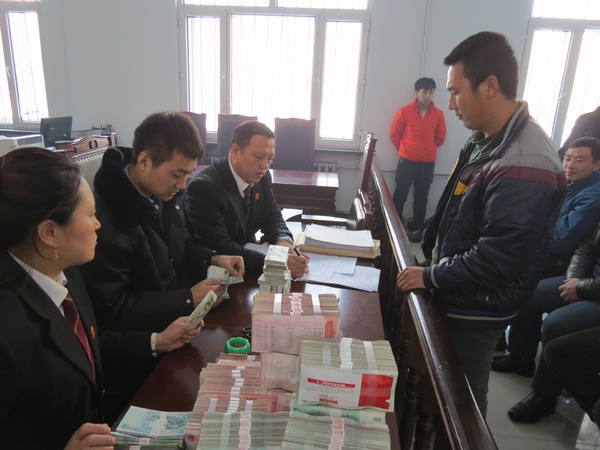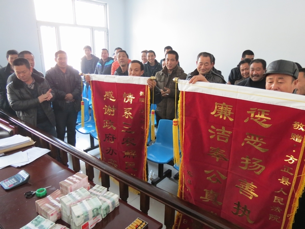该案调解结案后,被告方又以资金不足为由,拒绝履行义务,在这种情况下法院又迅速予以立案执行,启动了主动执行机制,并在不到7天时间里查找到了被执行人可供执行财产线索,一次性从其银行账户中扣划出资金140万元,被执行人也认同了给付责任。2014年2月18日方正县法院办理了涉农执行款交付现场会,该案25户农民悉数到场涉农代表高声朗诵致法院的感谢信,并向法院赠送锦旗一面,上书“惩恶扬善执行神速,廉洁奉公真诚为民”。