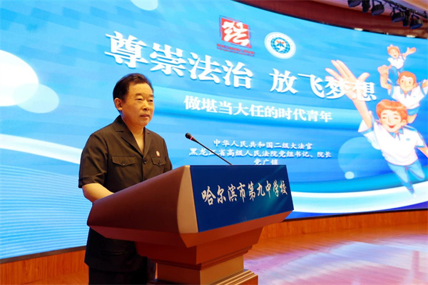 青少年是国家的未来、民族的希望,青少年的法治素养事关社会文明程度和法治建设进程。9月1日上午,黑龙江省高级人民法院党组书记、院长党广锁走进哈尔滨市第九中学,受聘法治副校长,为该校师生讲授了一堂精彩法治课。课堂上,他从中华法系的历史和演变、中华优秀传统法律文化的特征和精华、中国特色社会主义法治的发展和优势等方面,阐述法治中国的昨天、今天,展望法治中国的明天,与师生共同触摸中华法律文化的脉搏,教育引导同学们坚定法治自信,坚守法治精神,成长为德才兼备的高素质人才。全省中小学生及部分家长同步收看了这堂法治课。