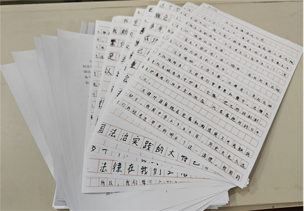法治课后,大家感触很深,讨论热烈,纷纷书写感受,表示要崇尚法治,遵纪守法,树牢理想信念,勇担强国建设、民族复兴的历史使命。