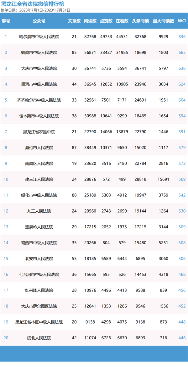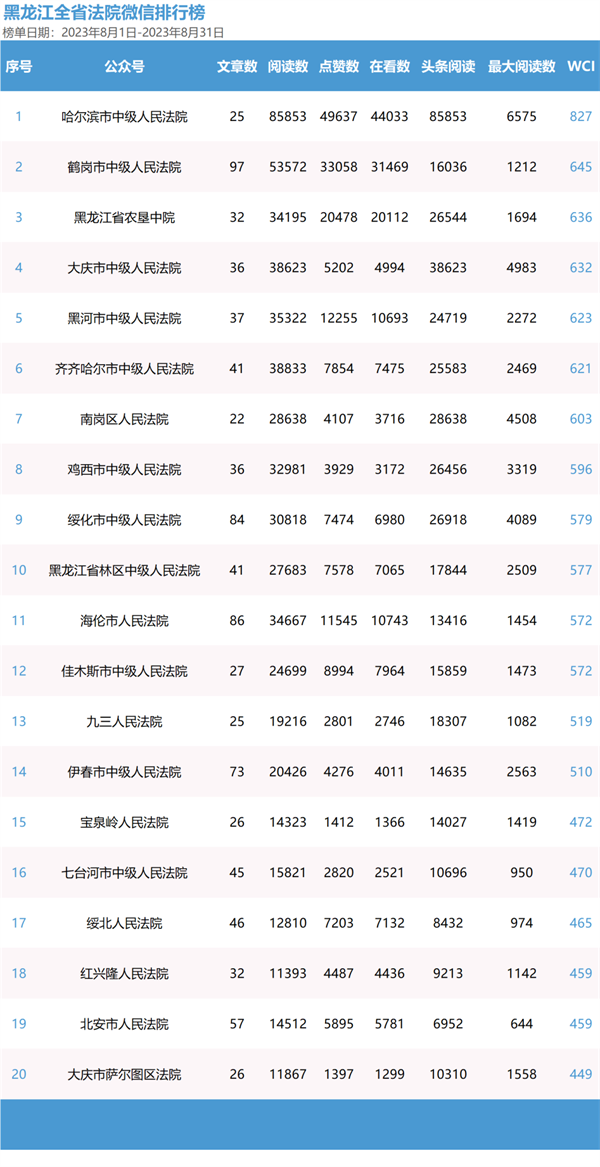第三季度微信榜单中,哈尔滨市中级人民法院夺得三个月榜首图片图片,多项数据领跑,最高WCI指数836。