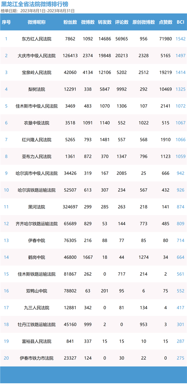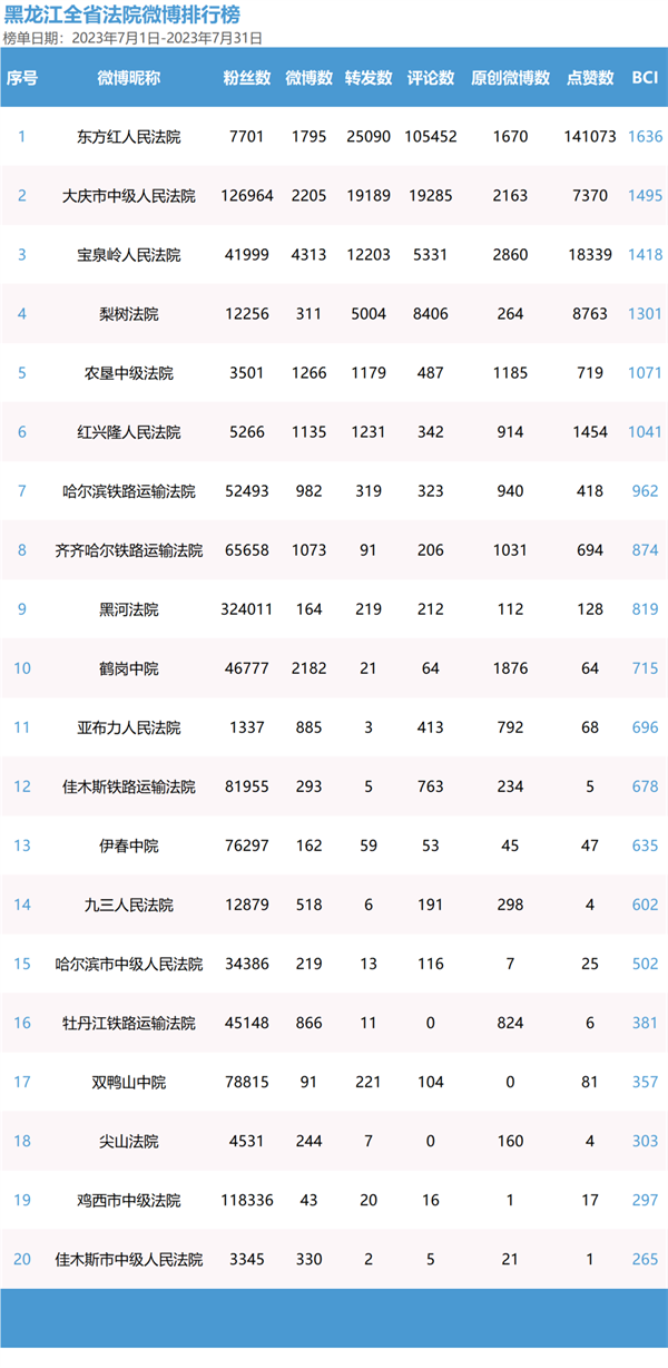 第三季度微博榜单中,东方红人民法院获得两次榜首、一次第二;大庆市中级人民法院获得一次榜首、两次第二图片图片图片。