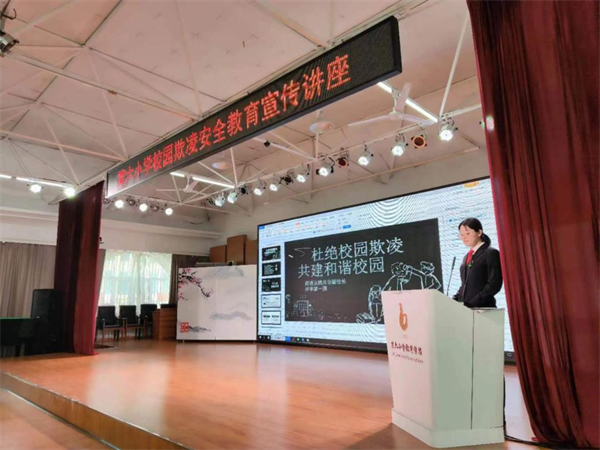 大庆市让胡路区法院法官薛强刚换下法袍走下审判台,就又站到了大庆第一中学的讲台上,以“防范校园欺凌 守护学生安全”为主题,利用多媒体教学设备以“现场+线上”的方式同时授课,为900余名高一新生送上新学期法治教育“第一课”。
