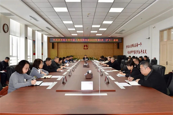 1月23日下午,齐齐哈尔中院召开党组扩大会议,深入学习贯彻全省中级法院院长会议精神,总结工作成效,聚焦改革任务,部署重点工作。齐齐哈尔中院党组书记、院长朱卫国主持会议并讲话。会议强调,全市法院要迅速把思想和行动统一到会议精神的落实上,坚持以习近平新时代中国特色社会主义思想为指导,深入践行习近平法治思想,全面贯彻落实省市委、省法院的工作部署,围绕省法院对高质效司法的明确要求,找差距、补短板,守正创新、善作善成,以实际行动做好全市法院2025年工作。坚持旗帜鲜明讲政治,凝聚推动高质效司法发展的强大合力。坚持聚焦改革大局,狠抓服务市委重大部署的“九分落实”。坚持全面施行“六清管理”,确保各项工作平稳有序推进。坚持直面问题短板,推动全市法院审判质效提档升级。