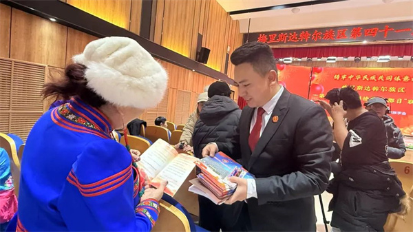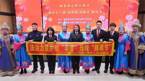 梅里斯达斡尔族区人民法院以铸牢中华民族共同体意识为主线,牢牢把握各民族“共同团结奋斗、共同繁荣发展”主题,坚持提升“非遗”保护法治化水平,充分发挥法院职能,组织达斡尔族法官及干警向前来参加第四十一届“阔德格•乌都日”联欢会的各民族群众提供优质高效法律服务,干警们向现场各族同胞派发普法宣传手册,并悉心向各族同胞宣讲介绍铸牢中华民族共同体意识的重要意义,为传承保护非物质文化遗产,守住民族“根”与“魂”贡献法治力量。