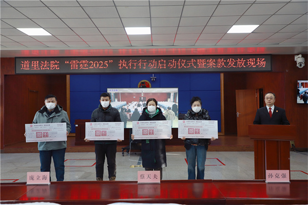 哈尔滨道里区法院举行“雷霆2025”执行行动启动仪式。当天为一起合同诈骗罪责令退赔案件多名受害人进行现场案款发放。该案件涉及受害人众多,社会影响面广,通过精准研判案件情况,制定执行方案,迅速处置涉案财产,及时挽回了当事人的损失。2025年,道里区法院将始终围绕“公正与效率”主题,牢固树立司法为民理念,在提升执行案件质效上持续发力,及时兑现当事人的胜诉权益。
