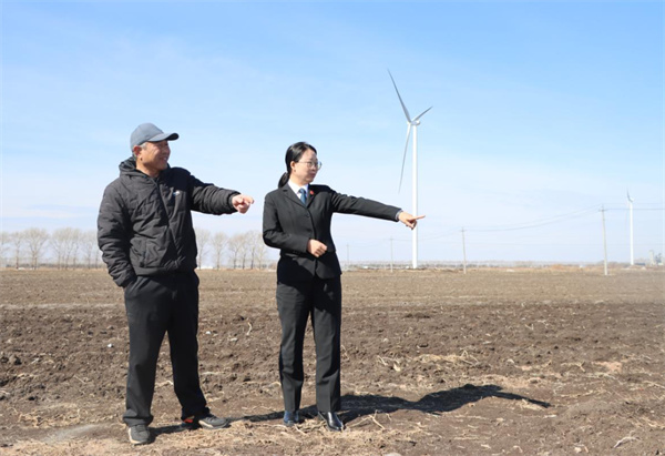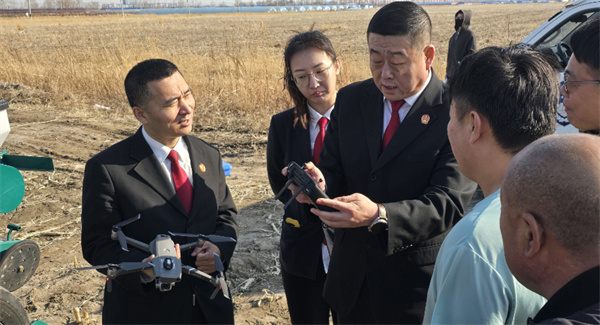 讷河市人民法院受理了一起涉土地承包经营合同纠纷案件。为全面了解案情,实质化解争议,承办法官采取“调解+实地测量”的方式解决纠纷,图为法官前往案涉地点进行现场勘察。